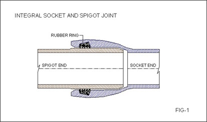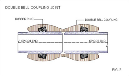 This is an un-restrained joint system which is used for the installation of long runs of buried pipe lines with only few accessories. Integral socket and spigot ends are joined together as in fig-1 or two spigot ends are joined with a double bell coupling as in fig-2. In this joint system, the hydraulic sealing is performed by elastomeric rubber rings, installed in circumferential groove on the integral socket and the coupling. Rubber rings are available in different materials like NBR, Neoprene and EPDM to suit the individual application. The installation in very fast and easy. Since it allows angular deflection, changes of gradient or curve can be easily accommodated and it is also called flexible joint. Concrete thrust blocks are required at the directional changes, as it cannot accommodate longitudinal Forces. |